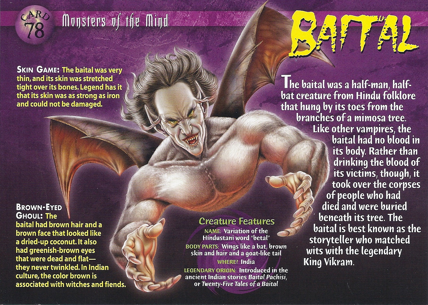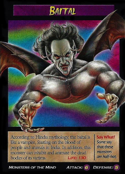 The baital was a half-man, half-bat creature from Hindu folklore that hung by its toes from the branch of a mimosa tree. Like other vampires, the baital had no blood in its body. Rather than drinking the blood of its victims, though, it took over the corpses of people who had died and were buried beneath its tree. The baital is best known as the storyteller who matched wits with the legendary King Vikram.