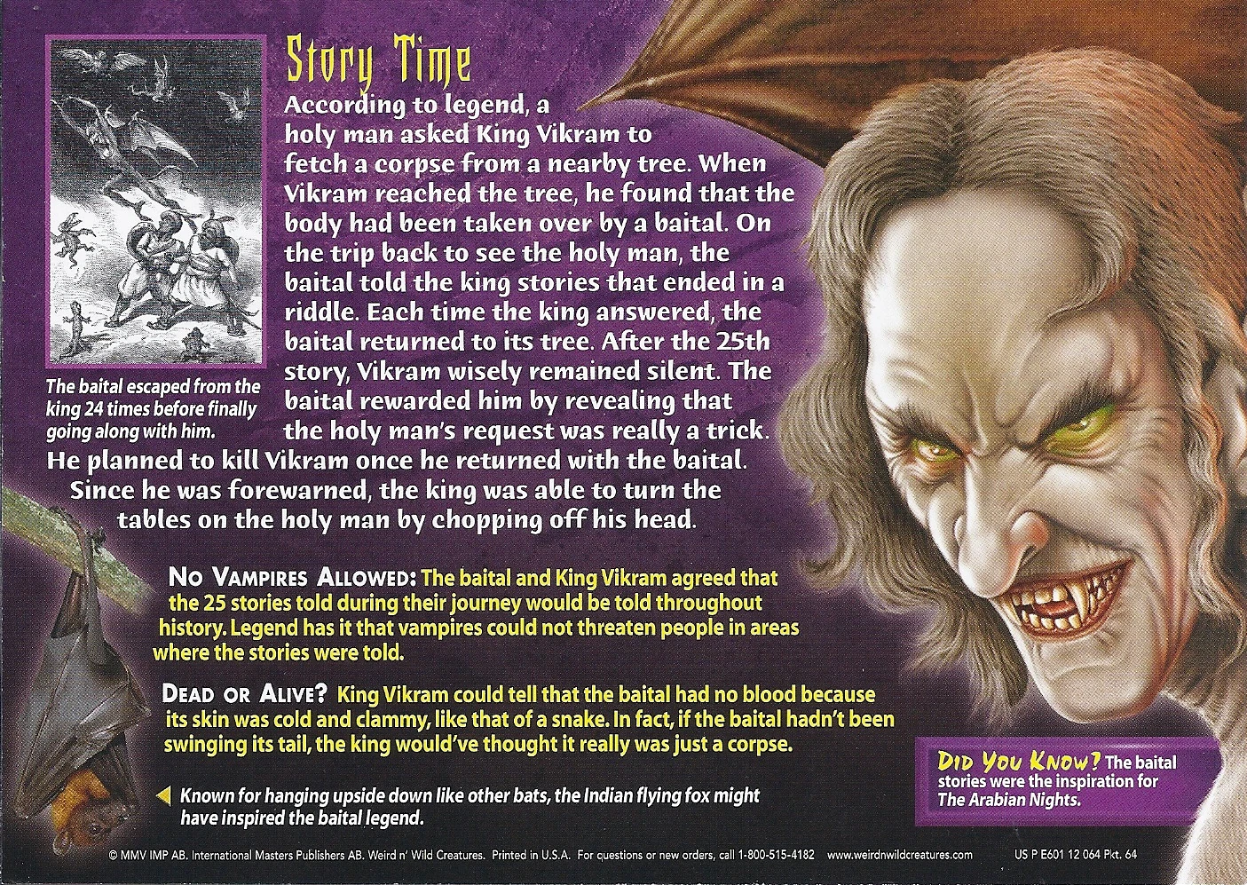 No Vampires Allowed: The baital and king Vikram agreed that the 25 stories told during their journey would be told throughout history. Legend has it that vampires could not threaten people in areas where the stories were told.