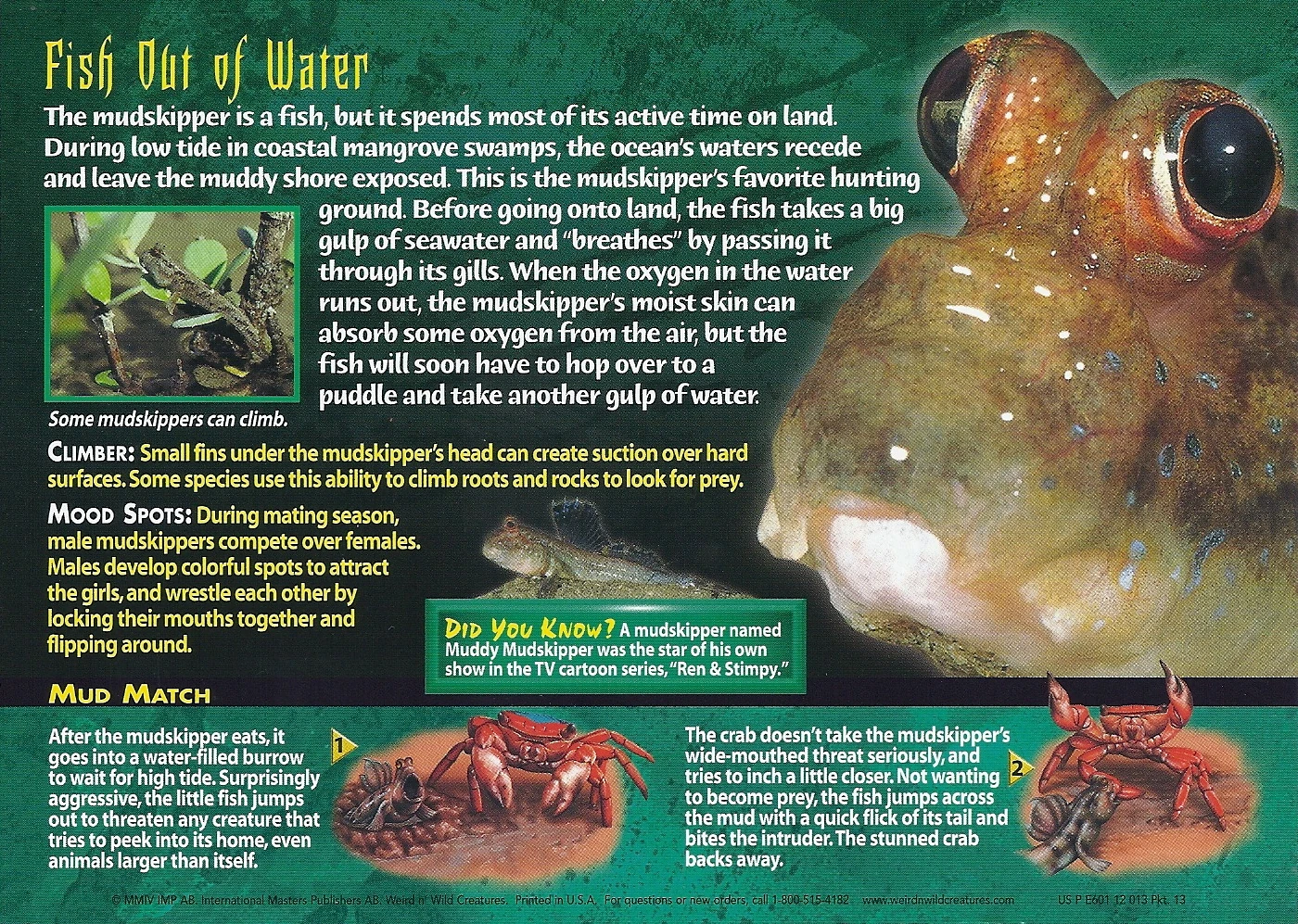 - The mudksipper featured in the illustrations, both the front and "Mud Match" on the back, is a Periophthalmus koelreuteri, and the one in photo on above the Did You Know? is a Periophthalmus barbarus.